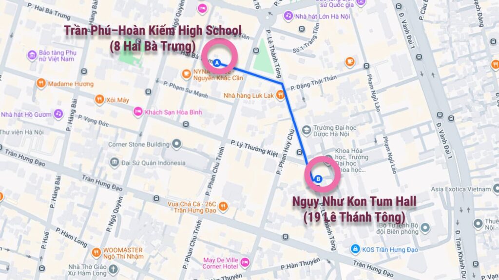 Map of the 5-10 minute walk between Trần Phú-Hoàn Kiếm High School and Ngụy Như Kon Tum Hall (~400 meters)